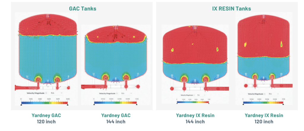 Simulation of the flow of water through a media bed-specifically, modeling laminar flow through a Granular Activated Carbon (GAC) or Ion-Exchange (IX) Resin Bed. A less turbulent model, shown in blue is indicative of a higher effective flow rate through a vessel preventing channeling, improving effectiveness of the filtration media and reducing pressure differential across the vessel.