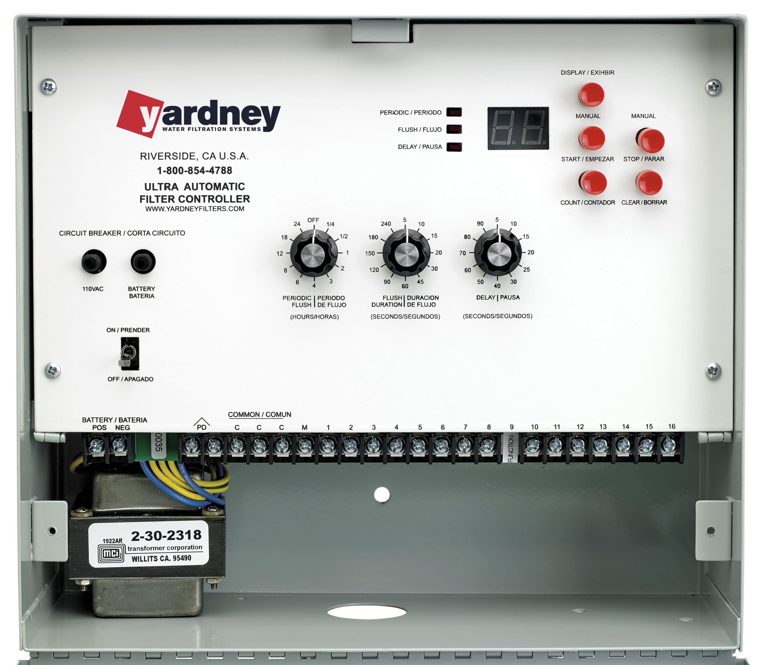 Yardney Ultra Automatic Controllers are simple and easy to use. The filter control system design features user selection flexibility of power source input (12V DC, 120V AC, 220V AC), output power type and number of stations up to a maximum of 16 stations per controller. The controller incorporates elapsed time monitoring as well as pressure differential activation with filter system backwashing activity reported through the backwash cycle counter program.